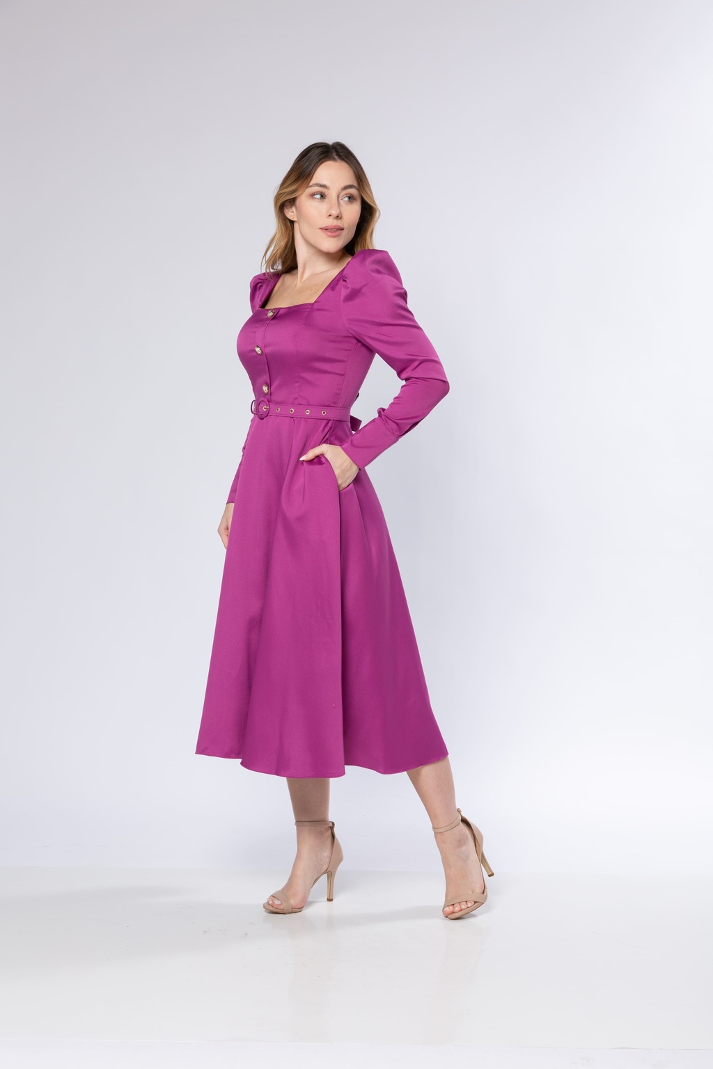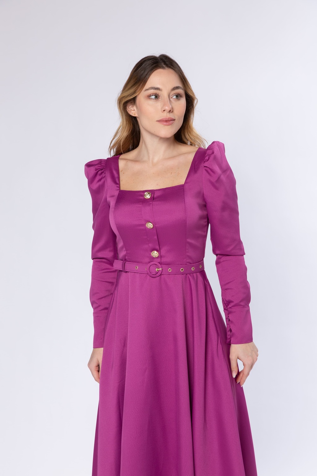 Sua modelagem acinturada com cinto delicado valoriza a silhueta com elegância, enquanto os botões dourados e a gola quadrada trazem charme atemporal. As mangas levemente bufantes comprida complementam o visual com uma dose extra de romantismo e elegância.
